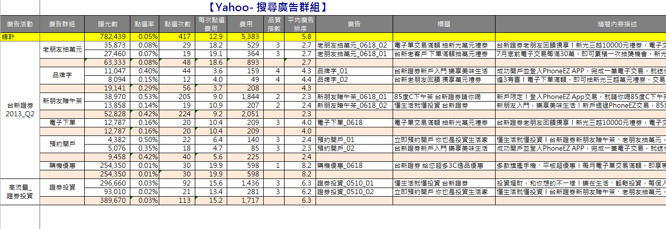 第三週開始,我就開始要去做一些結案報告,上個月走完廣告後,這個月就要開始做成效報表,製作成效報表就是要到各大媒體的管理後台去拉報表(例如yahoo、msn、google等等),包掛關鍵字成效、廣告群組成效、廣告活動成效等等,去整理出一份給企業端的活動總成效或是月報表。整理月報表最需要的就是耐心和細心了,因為媒體給成效時,有時候後台報表的日期會重疊或是數字會有差異,你都需要一一檢查。再來就是要出總成效分析,必須製作表格,分析廣告的KPI是否及格、合理,並給企業建議。例如做中信房屋的案例時,就要分析當時關鍵字搜尋量最多的是那些廣告群組字,是地區導向還是服務導向,並且簡單分析當時房市趨勢與廣告成效之關係。這週對我來說的挑戰比較大,因為對於許多產業在工作前並不是那麼熟,我做的分析工作又跟正職差不多,所以必須要花較多心力。